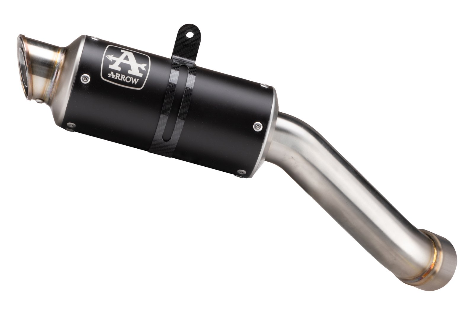 La fascetta di supporto è ora disponibile in carbonio (sostituisce la precedente realizzata in lega di titanio) ed è stato introdotto il nuovo marchio dedicato agli scarichi racing Arrow (adesivo termoresistente per la versione in titanio e marcatura laser per le versioni in lega d’acciaio “dark”).